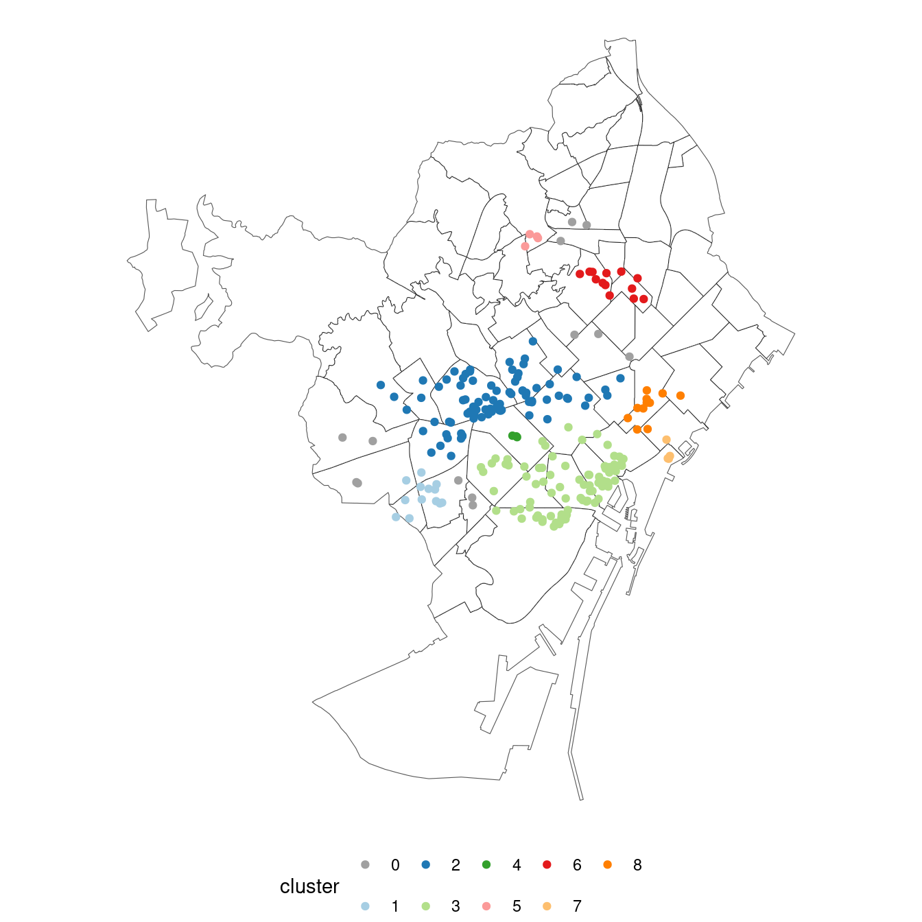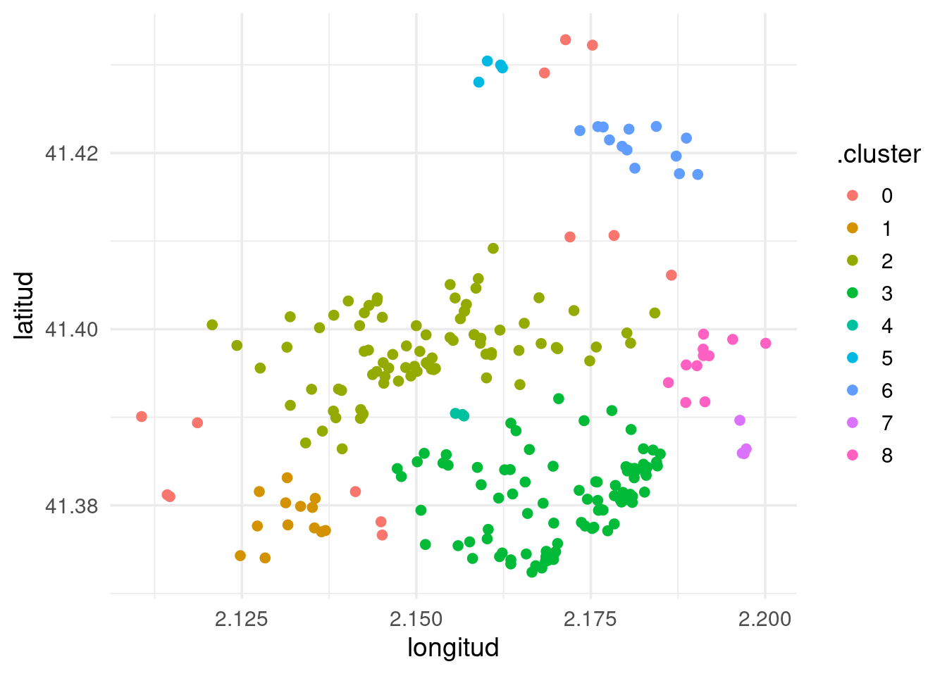 2corresponds with the city downtown, and3with the more residential districts of Gràcia and Sant Gervasi. - Three medium-size clusters. Cluster
