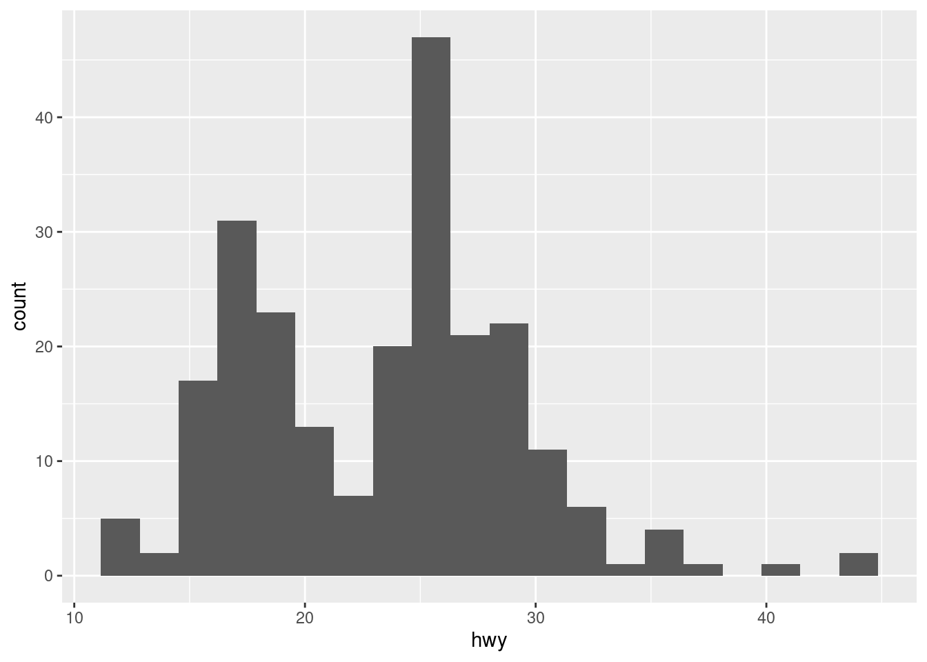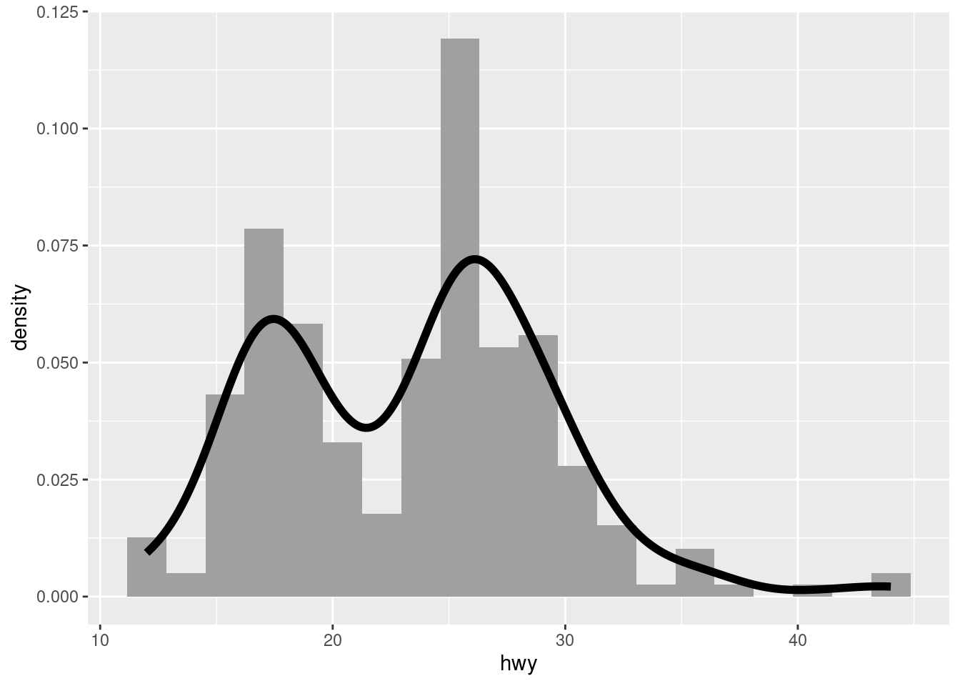 ggplot(mpg, aes(hwy, y = after_stat(density))) +