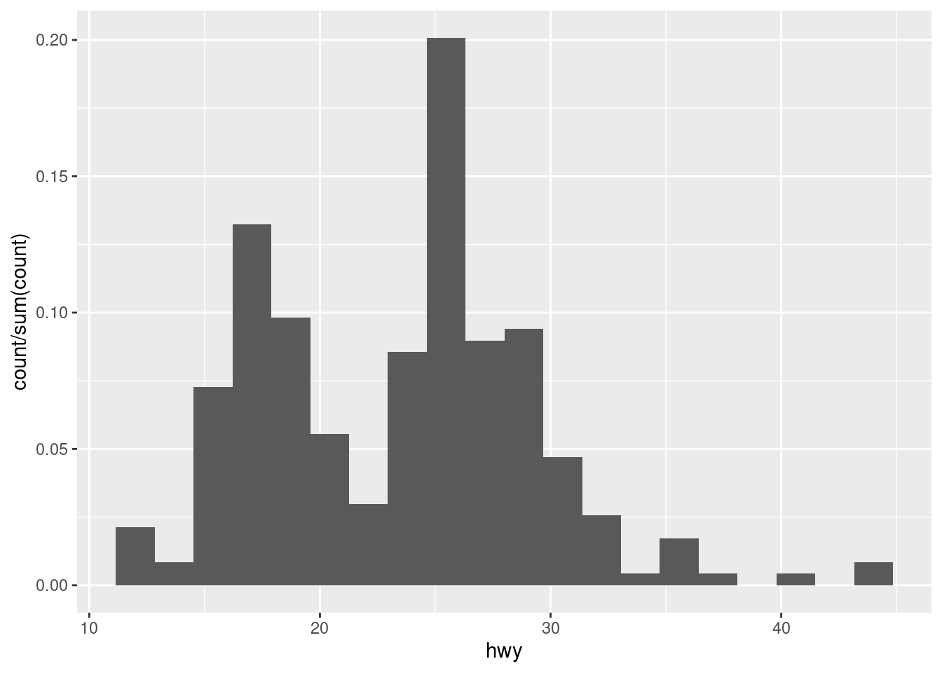 ggplot(mpg, aes(hwy, y = after_stat(count / sum(count)))) +