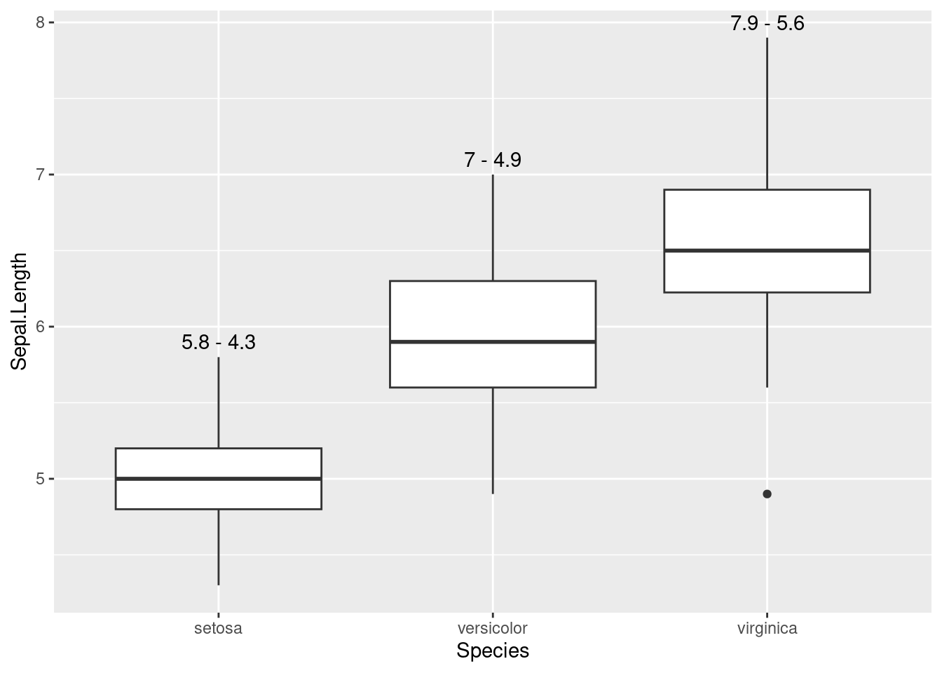 In the first two lines of the plot, I am making a boxplot for each value of Species. Then, I am placing a label with geom_text() as follows: