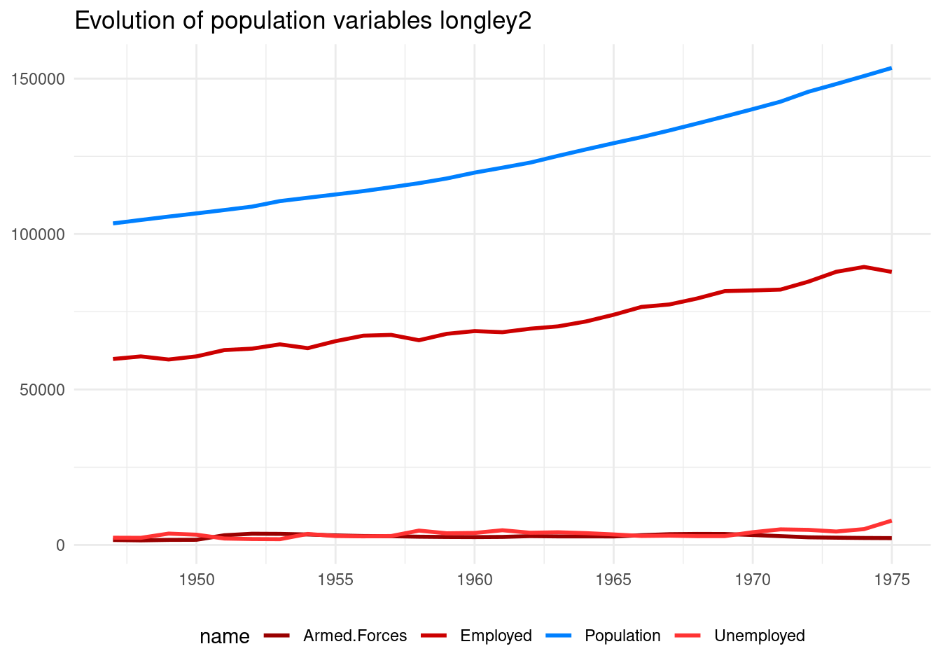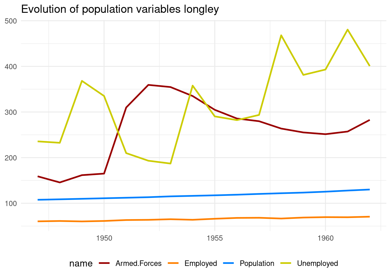 labs(x = NULL, y = NULL, title = "Evolution of population variables longley")
