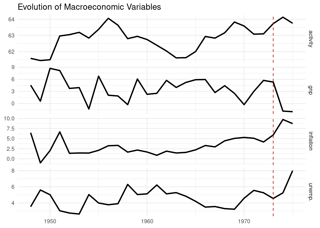 Here is the temporal evolution of the variables. For years 1974 and 1975 we can see the effect on unemployment and inflation of the oil shock crisis which started in 1973 (see the dashed red line).