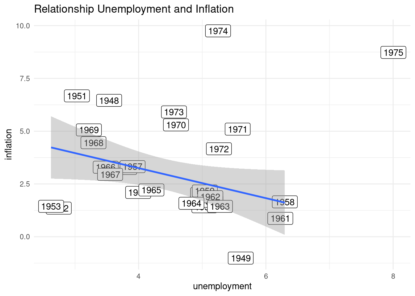 labs(x = "unemployment", y = "inflation", title = "Relationship Unemployment and Inflation")