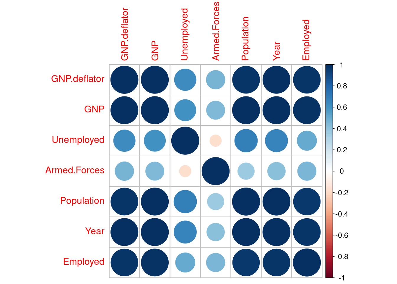 Except Unemployed and Armed.Forces, all variables are highly correlated. This can be explained by the growth of population and inflation in the US in the 1947-1962 period.