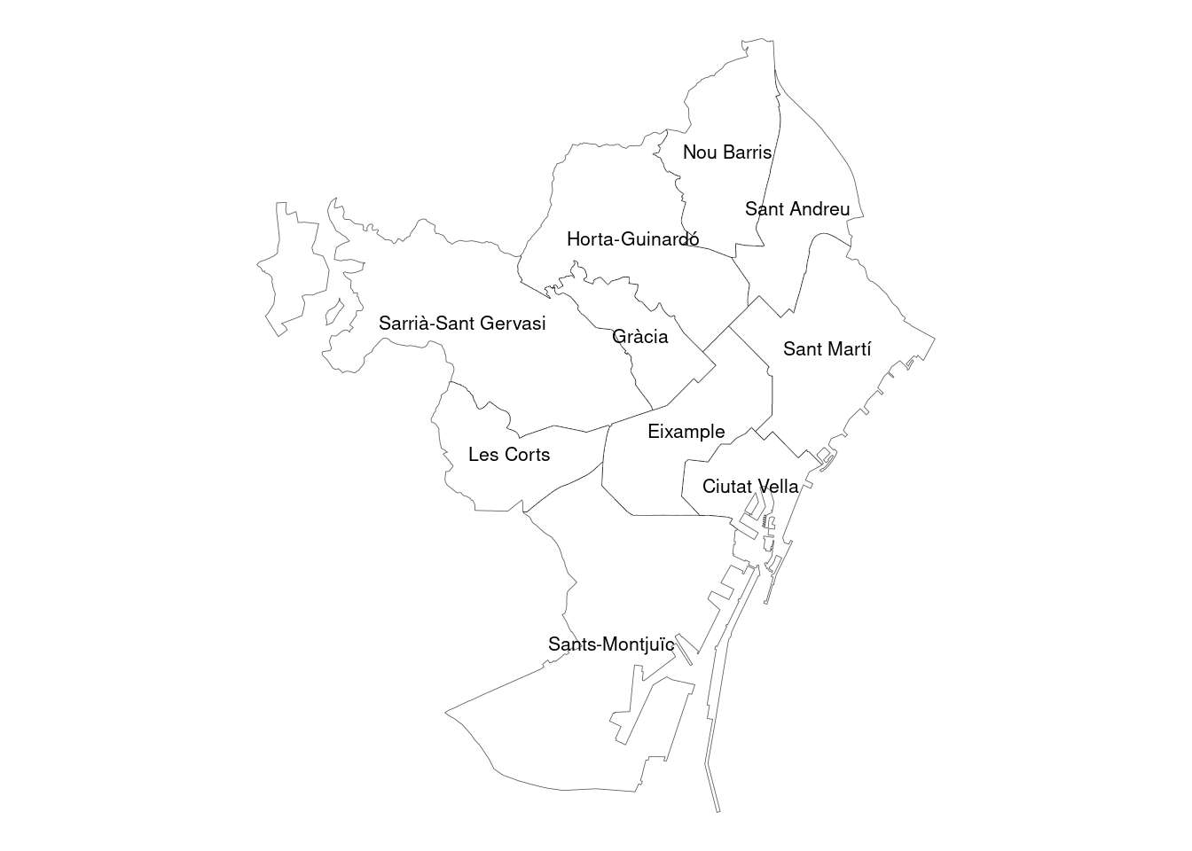 I retrieve the map of Barcelona districts from the BAdatasetsSpatial package.