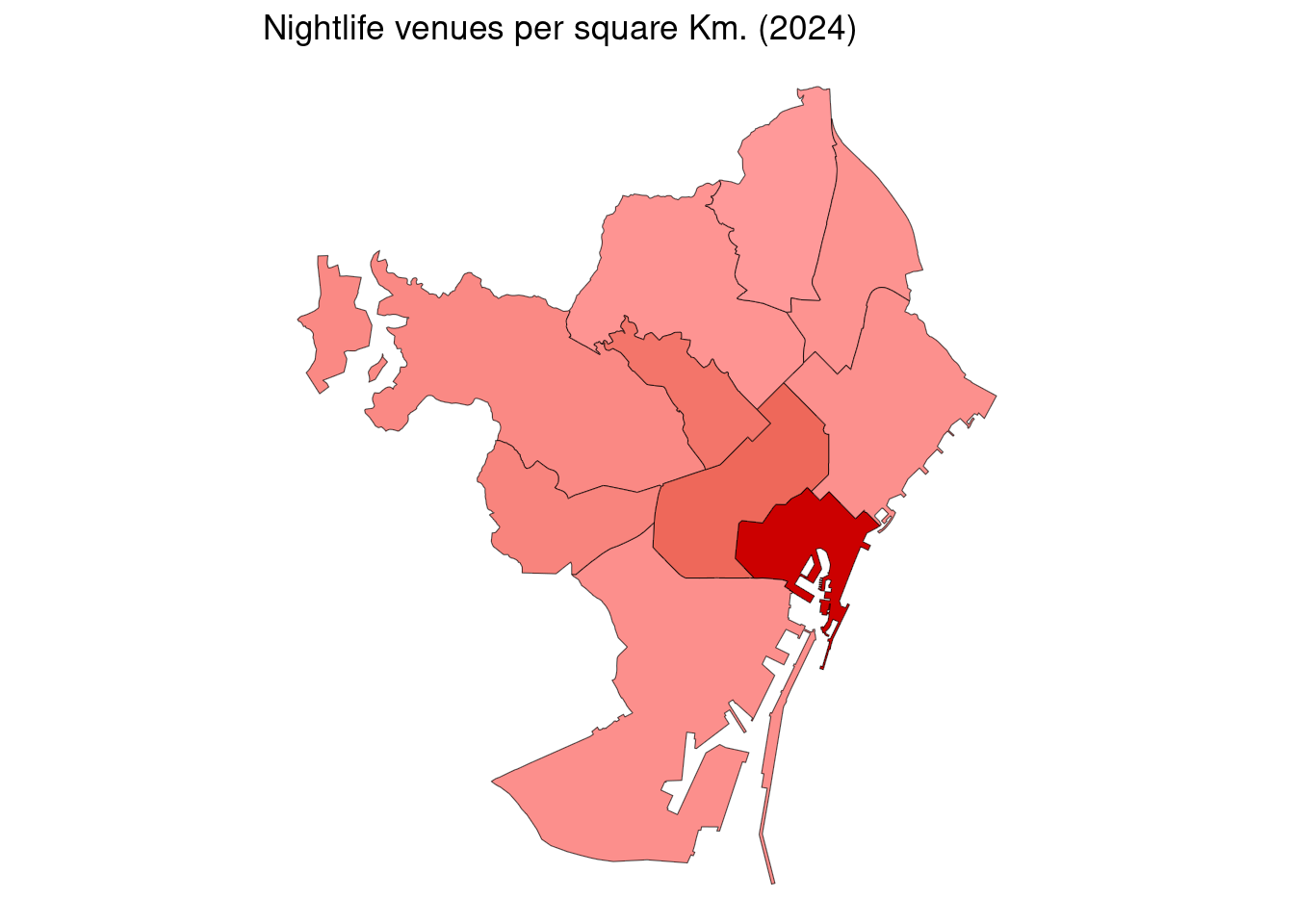 In this post, I will carry out a preliminary examination of the spatial configuration of Barcelona nightlife, analyzing the impact of nightlife across districts. I will use data about commercial activity from 2019 and 2024. The availability of data for these two years allows comparing nightlife activity before and after the 2020 COVID-19 pandemic.