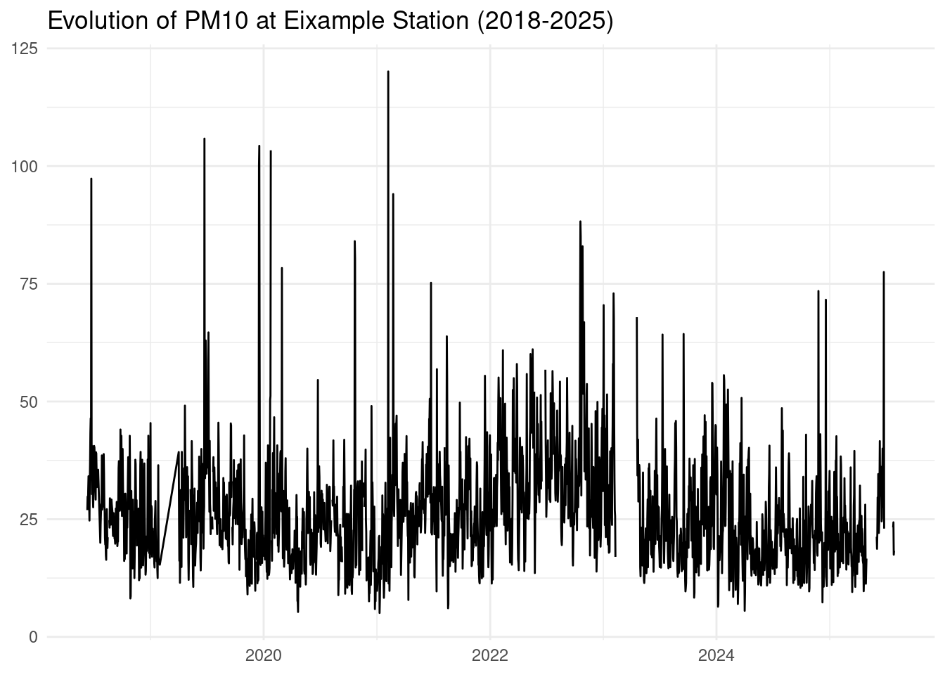 labs(title = "Evolution of PM10 at Eixample Station (2018-2025)", x = NULL, y = NULL)