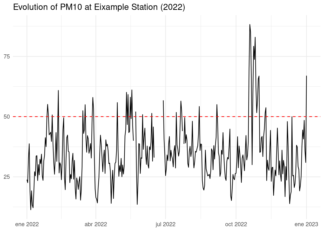 labs(title = "Evolution of PM10 at Eixample Station (2022)", x = NULL, y = NULL)