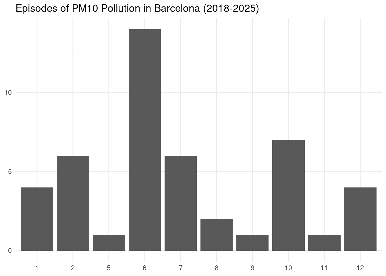 labs(x = NULL, y = NULL, title = "Episodes of PM10 Pollution in Barcelona (2018-2025)")